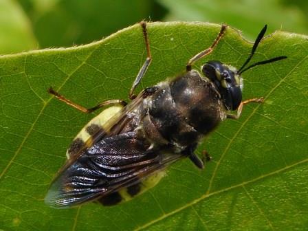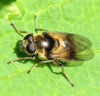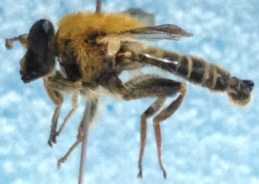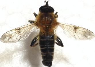 ご推察のとおりMallota属です。 画像を見ると、複眼が左右離れて見えます。おそらく複眼に立毛を伴わないグループと思われます。これには、M. tricolor:トゲミケハラブトハナアブとM. inopinata:ミケハラブトハナアブモドキの2種が日本にいます。この2種の区別には、後転節に剛毛が密生したトゲ状突起があるかどうかと、Geniの形状で区別できますが、今回の画像だけでは判別できません。拡大画像をUpしていただければわかると思います。 どちらの種にせよ、近年の都内の記録が皆無と思いますので、是非確認したいですね。よろしくお願いします。