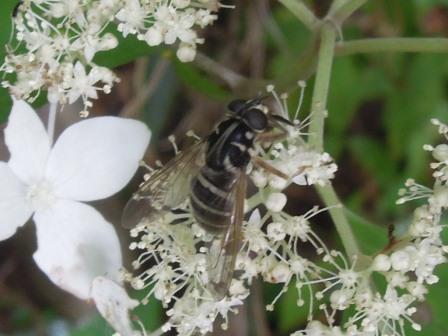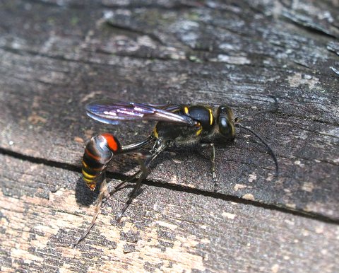 お尋ねするところが違ったようですね、すみません。 ヒントを頂いて調べなおしましたら、モンキジガバチと判明しました。 有難うございました。 |