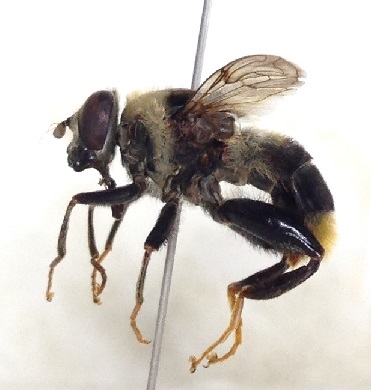 前脚腿節が褐色に見えるのでTemnostoma sp.1ミナミヒメヨコジマナガハナアブの可能性が高いように思われます.