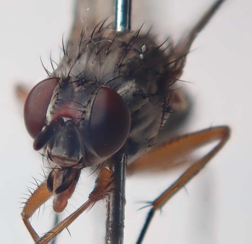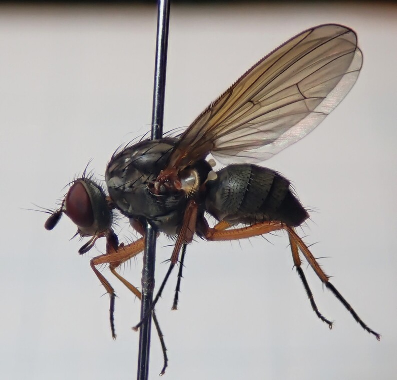 本日、21:00頃駅の灯りに1匹のハエが飛んできましたので、持ち帰ってきました。体長は、約7ミリ。翅は、約6ミリでした。 無知なので、同定に用いる形質が分かりかねるのですが、何枚か撮影しましたので、添付いたします。