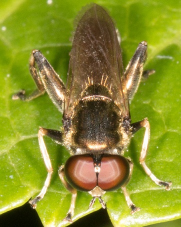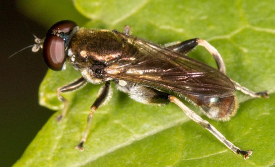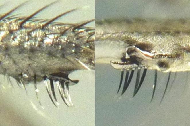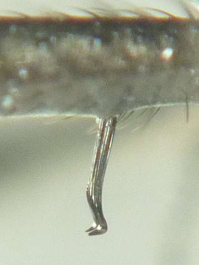 オオキドフタトゲバエは比較的大きな種で、小楯板にある強く長い一対の刺毛がきわめて特徴的な種です。 現時点では、宮崎県と熊本県と埼玉県しか記録されていませんが、少なくともこの間の都府県での多くには分布している可能性が高いと思われます。 |