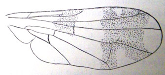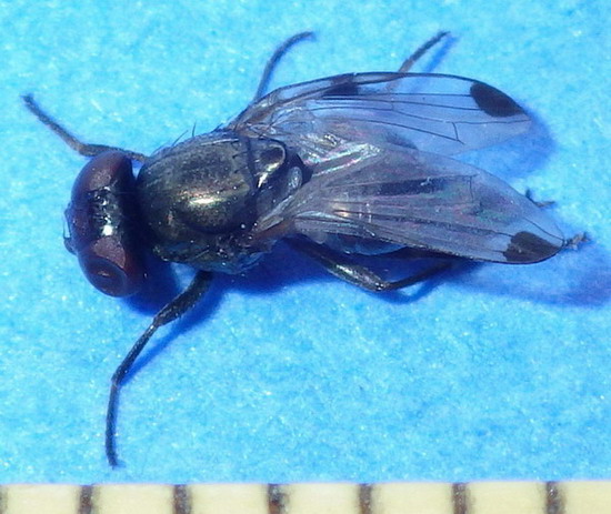 HMさん:分類形質が十分に現れていない画像ですが,投稿のハエはハモグリバエ科の1種で,中央室が矮小になっていますが,閉じられているので,Napomyza等の仲間でしょう.この画像から私に言えるのは以上で,ハモグリバエ科の1種ということです.ハモグリバエ科は膨大な種が生息し,同定には交尾器を含む詳細な形態の検討が必要でしょう.