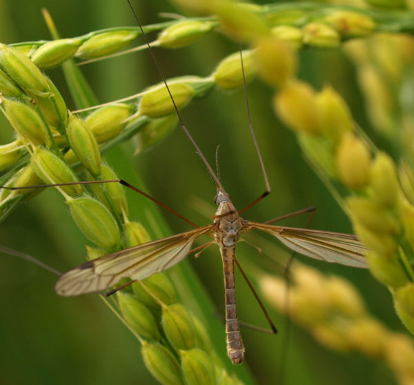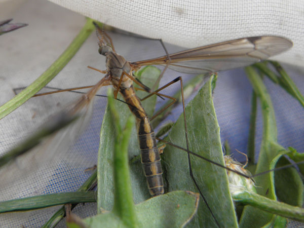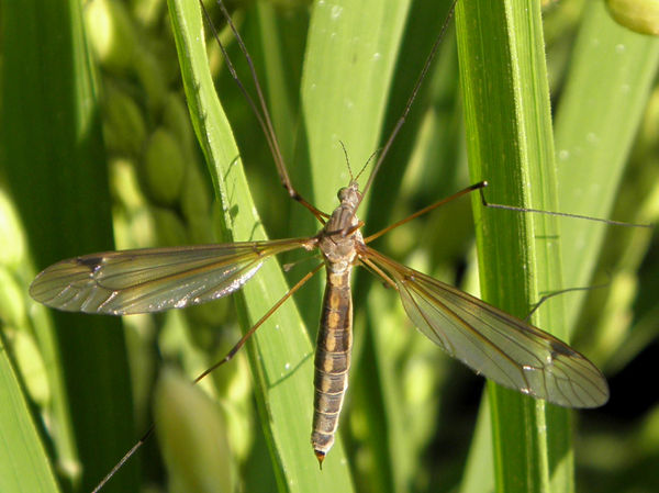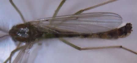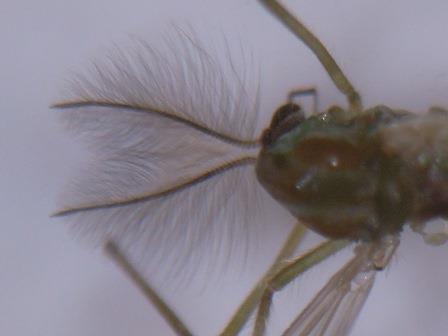 セスジユスリカChironomus yoshimatsui Martin & Sublette です。この種は年7−8回世代を繰り返します。冬季に出現する固体は、全体的に暗色となり、暖かい時期に出現する固体と比べて顕著に色彩が異なります。この種に大変よく似た種にヒシモンユスリカChironomus flaviplumus Tokunagaがいます。識別は、なれないと大変難しいのですが、セスジユスリカでは翅がややくすんでいます。たいしてヒシモンユスリカの翅は透明度が高くなります。また、雄生殖器の尾針の形状が側方から見たときに、後者は幅広苦なります。また、上底節突起も、ヒシモンユスリカは側方部が強く張り出します。