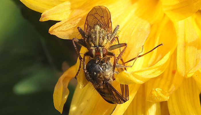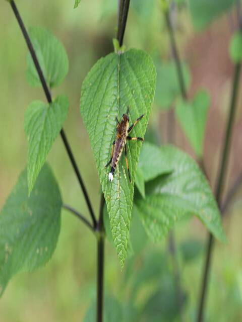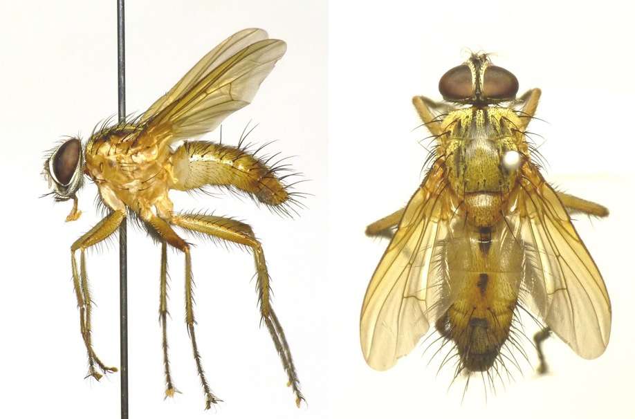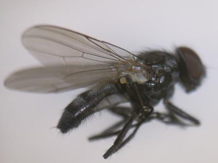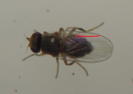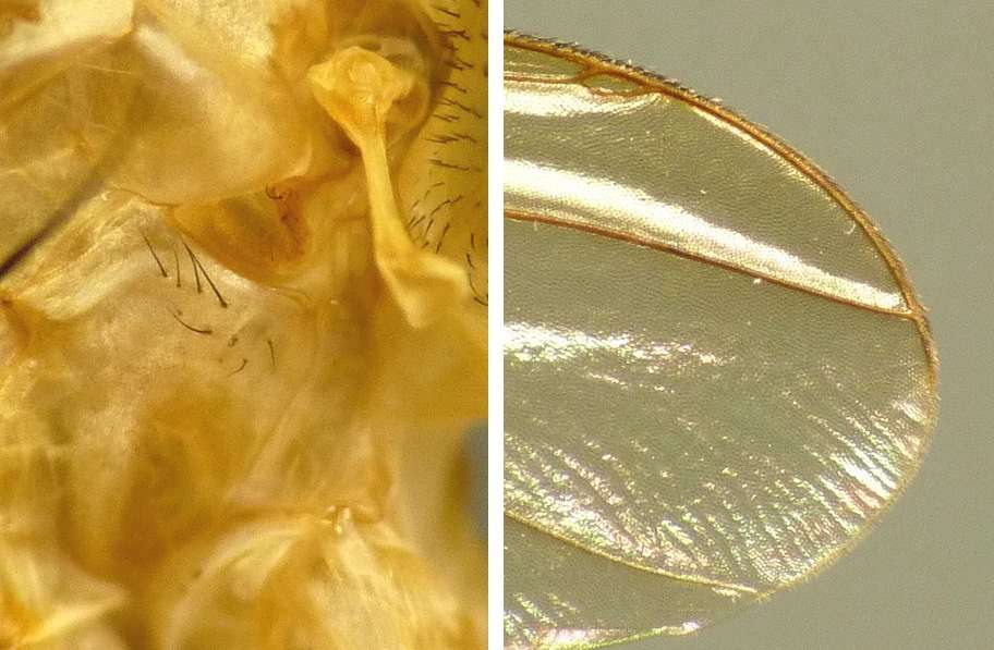 去年の年末にはヒメヤドリイエバエ属の投稿をしましたが,今回はヤドリイエバエ属です. 採集したのは半年前ですが2014年6月27日,岐阜県海津市南濃町,12.5mmです. 曇りの日に林床を飛んでいるのを見て,とまったところをすくいました. 見たのは一回のみです. 以前の書き込みで次は採集したいと書いたものとは違うものです. やはり後気門の下には不規則な毛があります.たまたまR2+3脈の先端が小さく分岐しています. 以前教えていただいたように,C脈がどこまで伸びているかは微妙だと思いました. R4+5で止まってはいません. しかしiaは0+2なのでSyngamopteraでいいと思います. 種の検索表では, 胸部は完全に黒色ではなく,第1腹板には刺毛がない. オスの額は狭く,前額帯は黒色か暗褐色. 少なくとも腿節は完全に黄色. 小盾板,胸部側板,前胸腹板,中胸気門はオレンジから黄色. これでキイロヤドリイエバエ Syngamoptera flavipes (Coquillett, 1898) になります. 日本のイエバエ科でも日本昆虫目録でも,見ると最初はSpilogaster属というものだったことがわかるのですが, Coquillett(1898)の334ページを見ると,それはハナバエ科だったようです. http://biostor.org/cache/pdf/55/2e/f4/552ef480a450a07ed447f42274110e28.pdf CuA+CuP脈が紛らわしいからなのかどうかは分かりませんが,科が違ったようです. |