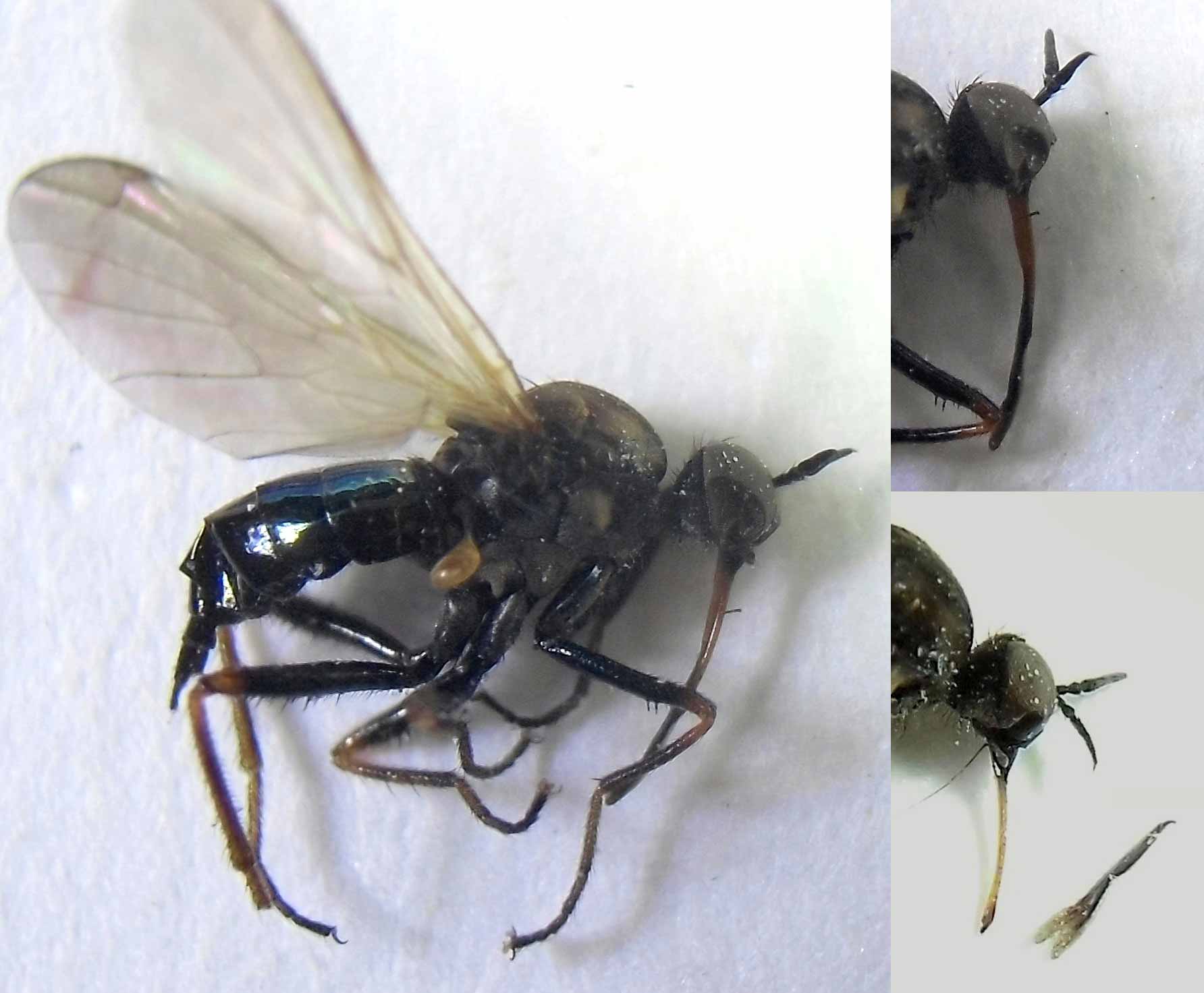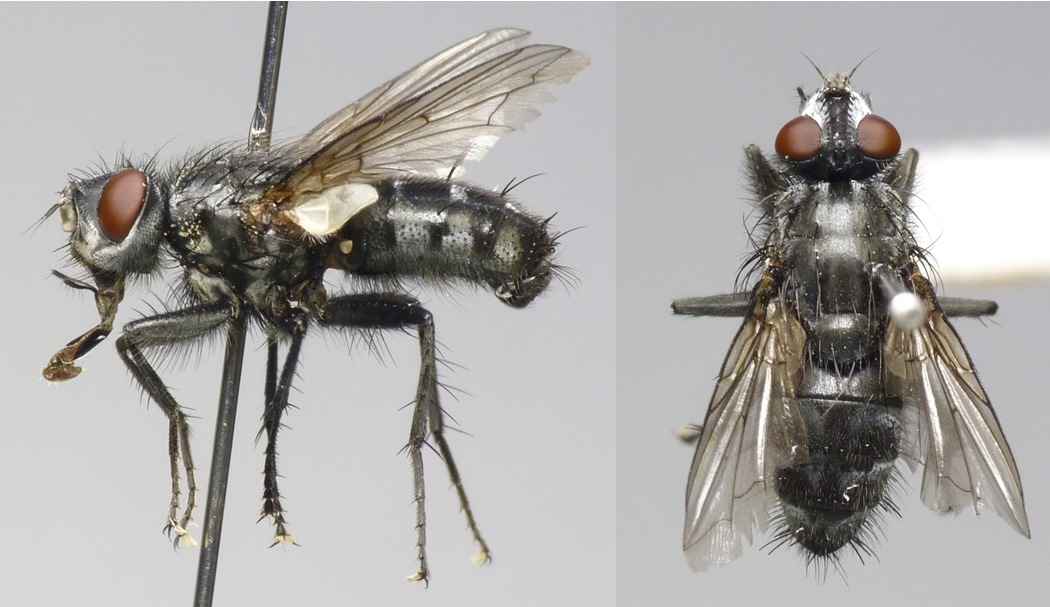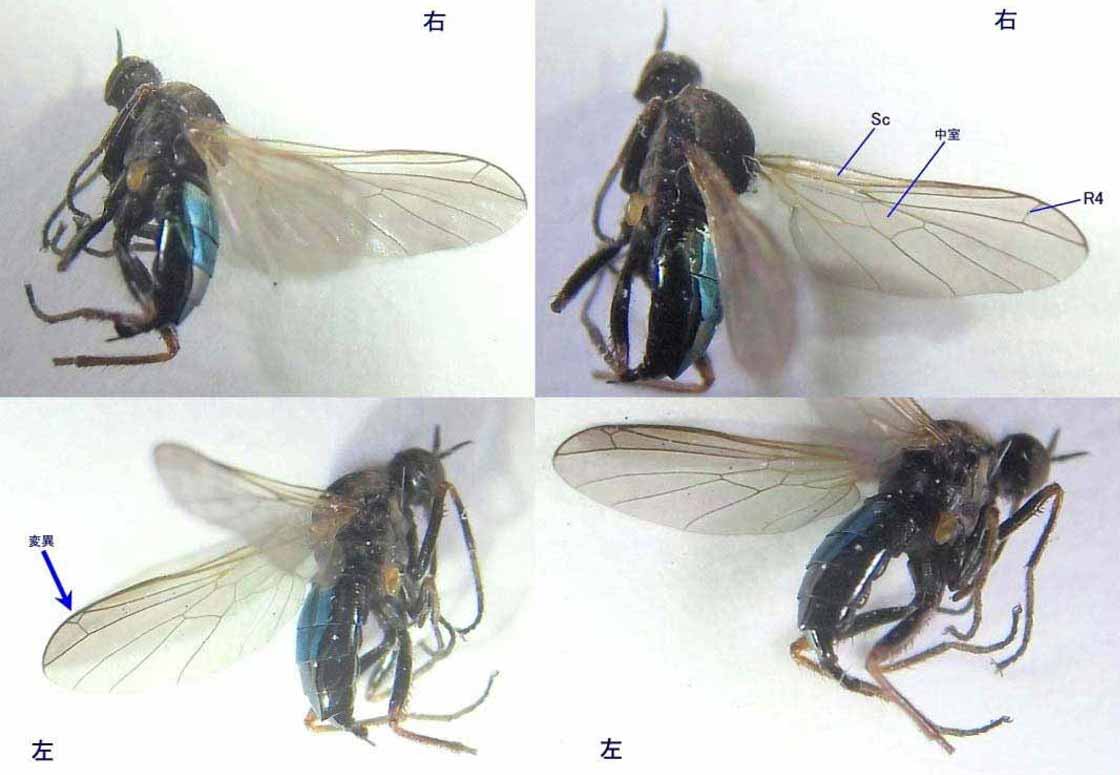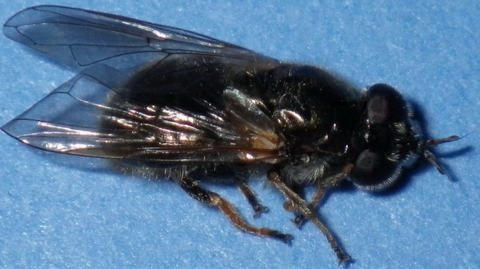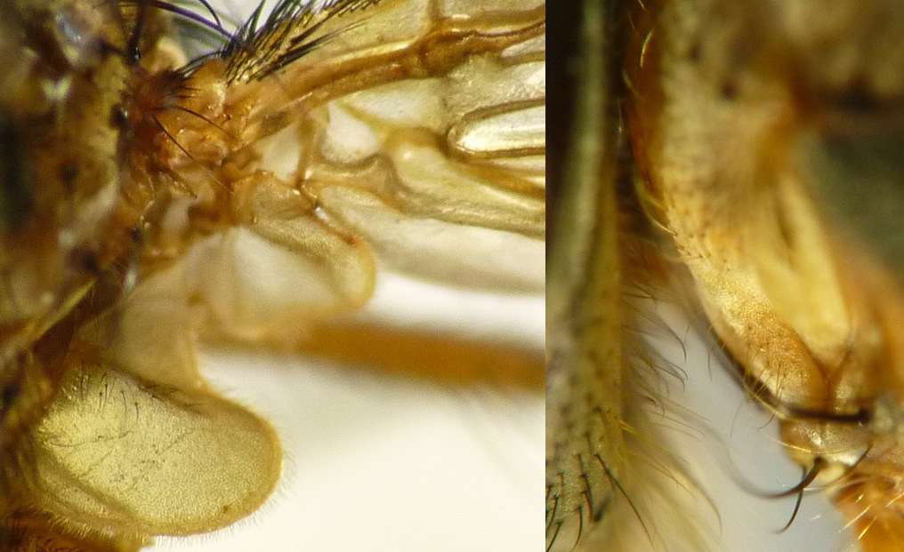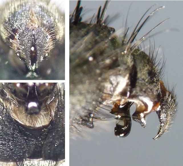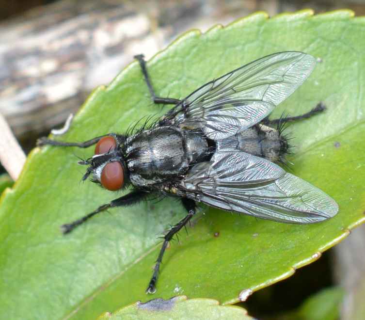 岐阜県海津市南濃町、2014年4月22日、体長10[mm]。ニホンクロニクバエを狙って度々通っていましたが、来たか来たかと思っていると間違えるのです。 後でよく見るとaristaは羽毛状ではなく、npは2本しかないので、普通のニクバエとは違います。 |