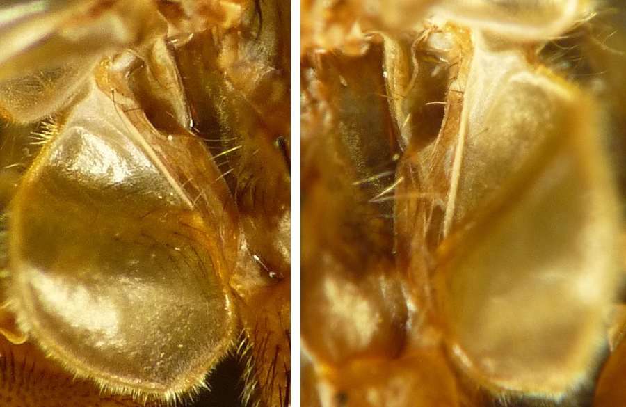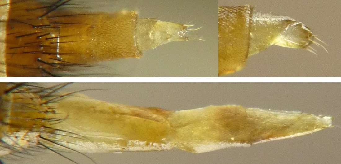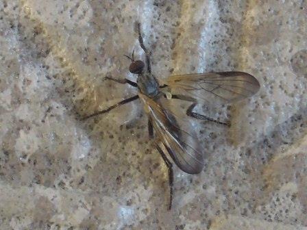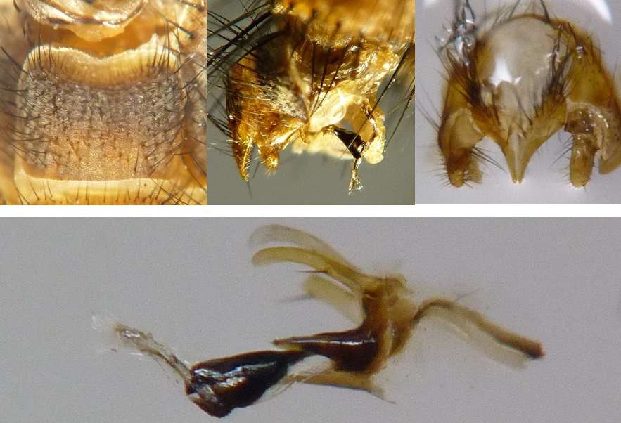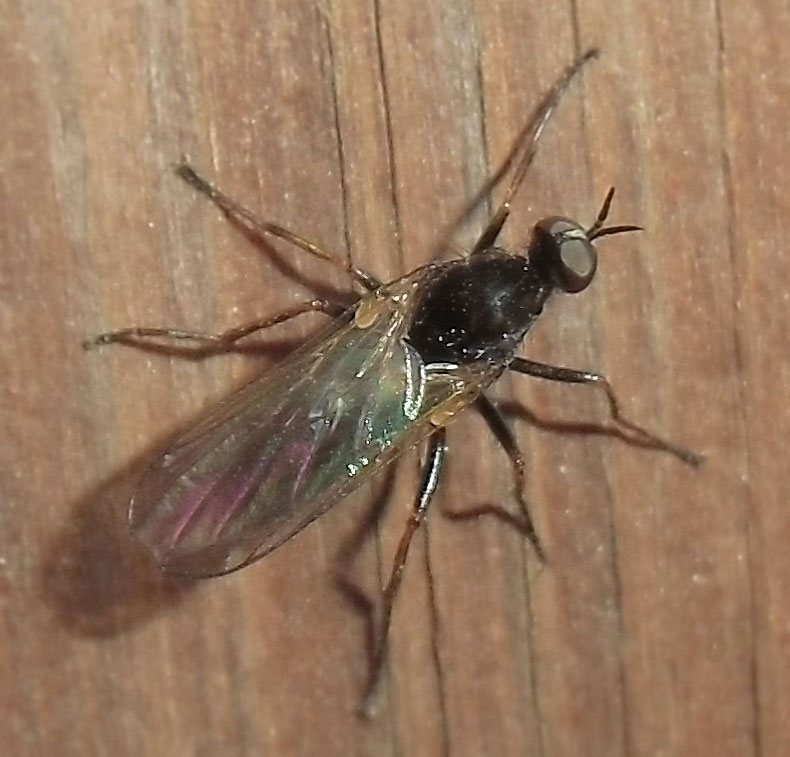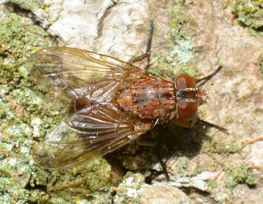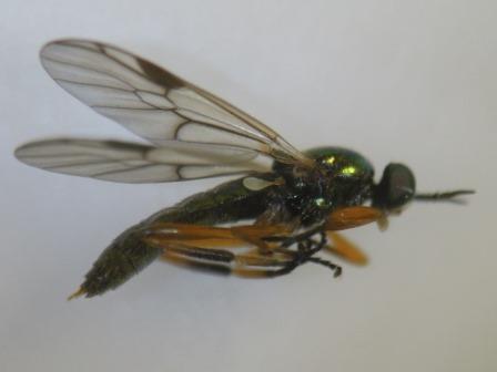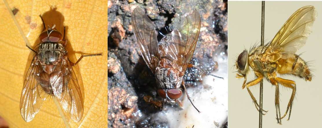 岐阜県海津市南濃町、2014年4月22日、体長10[mm]。ニホンクロニクバエを狙って度々通っていましたが、来たか来たかと思っていると間違えるのです。 後でよく見るとaristaは羽毛状ではなく、npは2本しかないので、普通のニクバエとは違います。 |