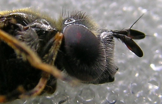 こんばんは。 クロハナアブ属でしたか・・・。触覚第3節が長いので、クロハナアブの仲間だと思いませんでした。ただ、ニッポンクロハナアブは私も同定したことがあるので、ニッポンクロハナアブでは無いと思われます。頭部側面の画像を貼り付けます。もし種名がわかるようでしたら、ご教授ください。