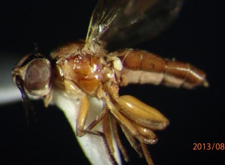 さんご様 御回答ありがとうございます。 そうなのですか!少し驚きです。 このハエは(私が採集した場所では)曇り(やや雨)の日、また晴れの日でも砂浜にいましたが数は少なく、動きがはやいためあまり多くは採れませんでした。今手元にあるのはこの画像の♂が1個体と(全く同じ場所で採集した)♀が3個体です。♂は1個体しか採れていなかったのと、現地で標本を作成するという悪環境であったため破損を恐れてゲニタリアはだせていません。掲示板の御回答次第でKOH処理をしようと考えていましたが、とりあえずはそのまま保管しておきたいと思います。 私は倉橋博士の連絡先を存じませんで、猫又様に仲介役をお願いしたいと思っております。ですから私があまり勝手なことは言えないのですが、私も是非さんご様の標本と共に見て頂きたいと思います。