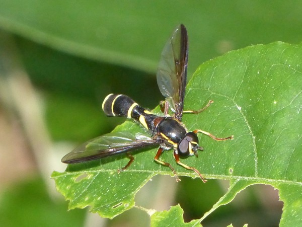 大変珍しいハナアブを写しましたね. Doros profuges オオコシボソハナアブの♂です. No.7271に♀の写真が載っています.