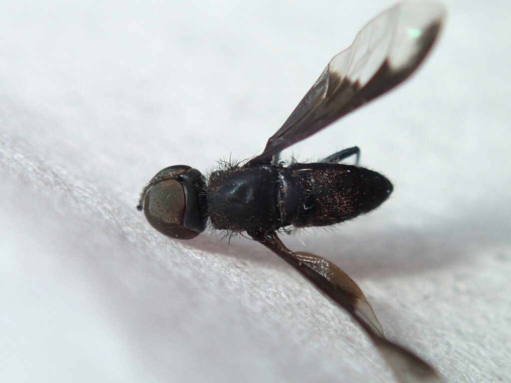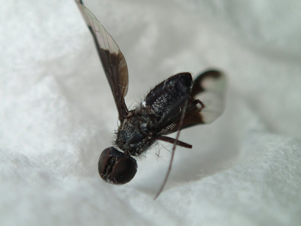 写真のツリアブは,ヤマシロツリアブBrachyanax yamashiroensisだと思います. ネット上の写真では,翅端に斑紋を欠く写真が多いですが,松村松年のタイプ標本はこのように翅端まで黒紋が伸びています.