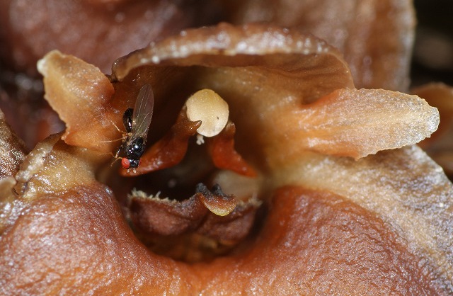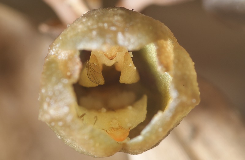 大変お手数おかけいたしました。ありがとうございます。 ポンチ様 確かに卵が孵化して1齢幼虫が這い出しておりますね。餌となる酵母菌もないですからそのまま餓死する運命なのでしょう。 おはようございます。これらのハエは育てないのですか。 まったくわからないことだらけです。 スレッドが長くなってしまったのでわけたほうがいいのですが、この花はこの時期にはとろけるように落ちてしまい、花の下の子房が膨らみ果実になりますが、この果実にも謎があって、その表面に妙な突起ができ、その先端に穴らしき凹みがみえるものも観察できます。 これもまるでわからないのですが、これはハエとはまったく無関係のものでしょうか。 こちらで質問するのはお門違いの問題かもしれませんが、何かヒントでもいただければと思いまして。 普通、こんな突起は見られないのですが、一部のものにこんな膨らみが生じます。小さくて表現できませんが、果実の表面が変形して隆起し、先端には凹みがあり、誰かが出たのかなァなんて思えるような形でもあるのですが、こんなものを見たことがないのでまったくわかりません。 最初の話題から全くずれてすみません。
