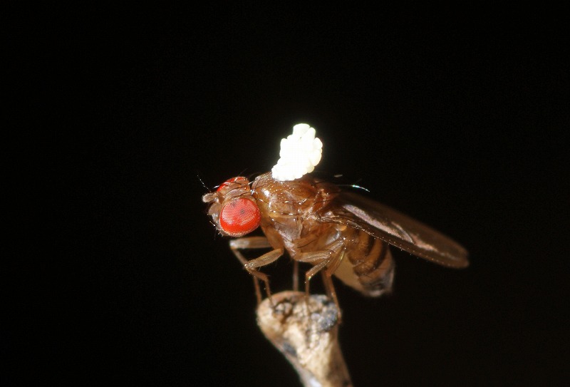 ありゃ!この最後の画像のショウジョウバエ、翅の末端の黒いマーク、これは恐らくオウトウショウジョウバエの雄ですよ!