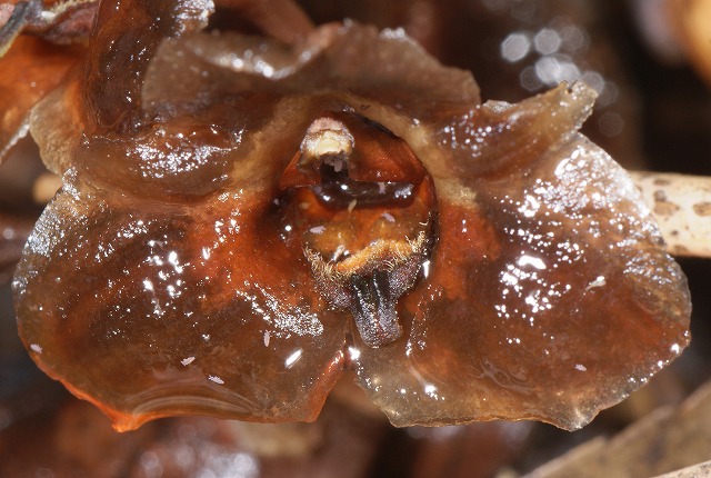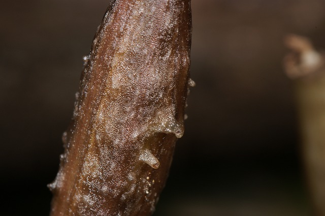 こんばんは。『オウトウショウジョウバエ』で検索してみると、確かに良く似たハエが出てきました。 いろいろな果樹やソメイヨシノ、なども訪れるような記述もありましたが。 これらのランを訪れるハエは、一種ではないのかもしれません。 というか、その方が自然な気もします。 ただ、その中で、花粉を運ぶのはある程度特定出来るんじゃないのかなァという推測もしますが、どうなのでしょう。 もともとこれらの花の開花期は短く、1年の内の2〜3週間程度。 ショウジョウバエは通年というか、もともとそこにいて、これらの花が開花すると、そのおそらく大好きな匂いに誘われて、ここを訪れるのかと思います。 周りの落ち葉などにもたくさん産卵しているのかもしれませんが、花の中に、これは卵じゃなくて「蛹」なのでしょうか? この花の上で交尾もするし、産卵もするようですが、それは1年のうちのほんの一時のはず。 他の季節は他のものにいるはずだし、その短い期間に、これらの花と共存して協力体制を作るのではないか。 なんて愚考というか、妄想したりしますがどうなのでしょうね。 唇弁の上の「蛹」? これ、サナギなのでしょうか。 周りの落ち葉なんかにもたくさんあるのかもしれませんが、小さすぎてもちろんわかりません。 現場で気付かず、PCに取り込んで初めてわかるお話ですが。 上の、7209の『アキザキヤツシロラン』の唇弁の上にもありますが、こちらは『クロヤツシロラン』の花の奥。現場ではまったく真っ暗で、撮影者にも見えません。 ただ、花の奥の怪しい膨らみめがけてめくら打ちして写ったものですが、過去にも撮れているので、ここが大好きなのは間違いありません。 が、意外にどこでもよかったりして・・・。 こういうのは私のような門外漢にはまったくわかりませんが。