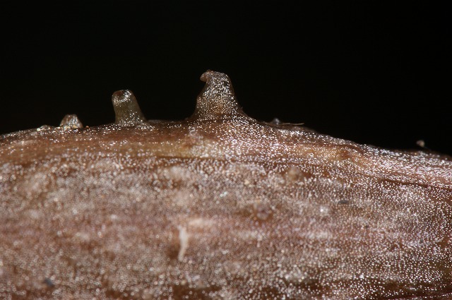 唇弁の上にあるのは蛹ではなく明らかにショウジョウバエの卵です。一方の端から突き出て見えるのは呼吸突起で、ショウジョウバエは発酵しつつある植物組織上の酵母のバイオフィルム上、あるいは軟腐しかけの植物組織中や種によっては植物の健全組織に導卵突起を刺して産卵します。 キイロショウジョウバエなどが第一のパターンでして、このグループの場合、導卵突起をほとんど産卵基質には刺さないで酵母のバイオフィルム上に横たえるように産卵するのですが、卵が軟らかいゾル質のバイオフィルム中に沈没して溺れる危険に常に曝されています。また、第二のパターンはオオショウジョウバエに見られるパターンで、まだバイオフィルム自体は広がってきていないが植物の組織自体は柔らかく崩壊しかけてきている部位に好んで鋭利な導卵突起を刺して卵を植物組織内に深く埋め込みます。この場合も植物組織からの液によって卵が溺れておかしくない環境です。また、オウトウショウジョウバエなどではさらに鋭利で頑強な導卵突起を持っており、オウトウ、ブルーベリー、ブドウといったベリー類の樹上の熟果の果皮を突き刺して果肉内に卵を埋め込みます。この場合も果汁で溺れかねない環境ですよね。こうした呼吸に不利な条件を、ショウジョウバエ卵は呼吸突起を空気中に突き出すことで凌いでいるわけです。 この産卵状態を見る限り、植物組織内への産卵は見られないようですので、植物組織が酵母によって発酵しつつある状態のものに産卵している『つもり』になっているのはほぼ間違いないでしょう(オウトウショウジョウバエも成虫の栄養摂取のためには発酵果実に飛来する)。つまり、アキザキヤツシロラン、クロヤツシロランは酵母によって発酵している植物質に擬態することで、さらに唇弁の上を酵母のバイオフィルムに擬態することで発酵植物質繁殖性のショウジョウバエを送粉者にしている可能盛大、ということではないでしょうか。