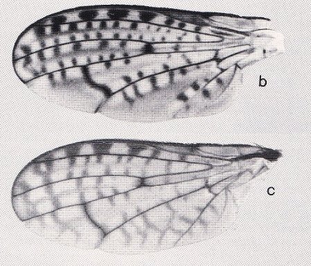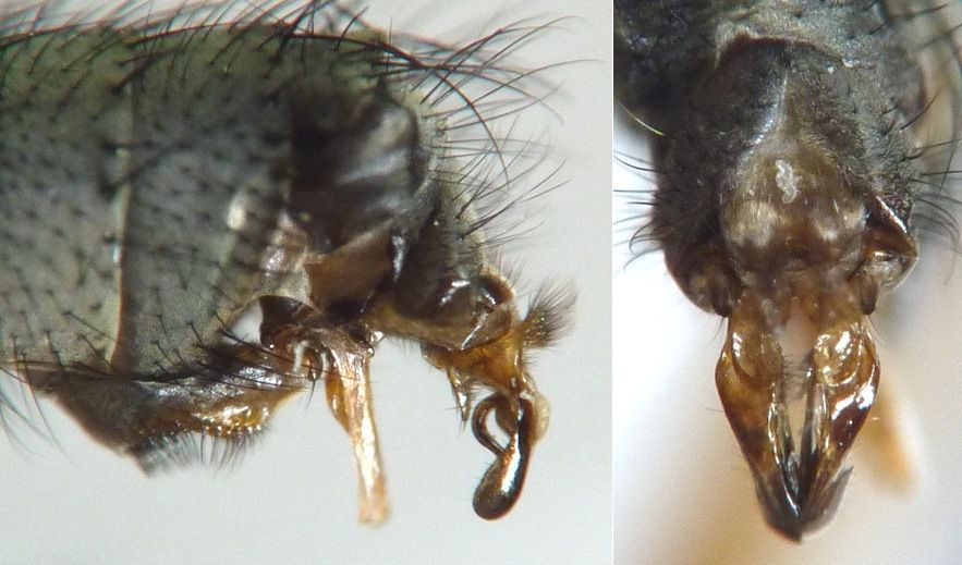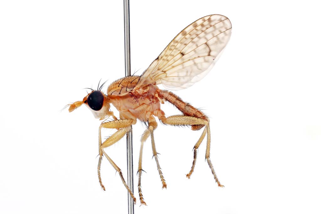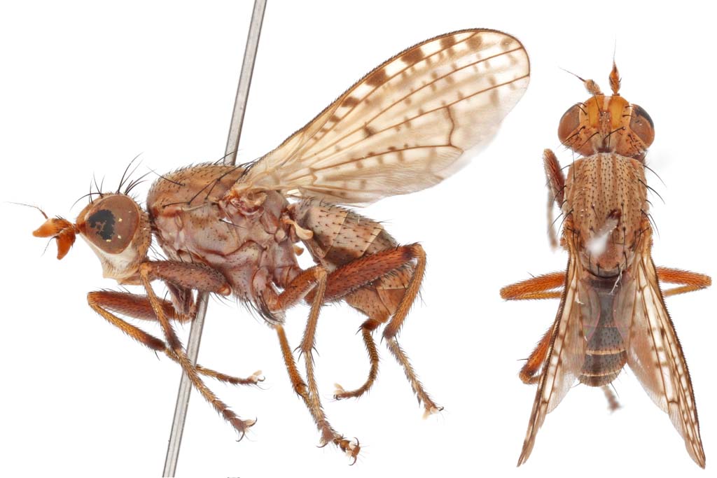 こちらが,体長約4.5mmとやや小ぶりで暗色な疑問種です.翅の斑紋が網目状とは言い難く,HydromyaやTetenoceraへも行けるのですが,該当しそうな種がありません. 茨城の北浦近くの湿地で採集しました. 前方の上額眼縁剛毛の基部に斑紋を欠き,側顔に淡褐色の斑紋を具えます.
