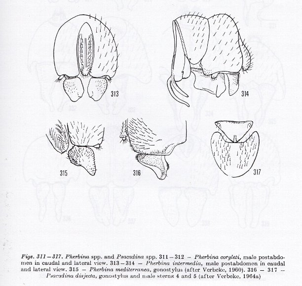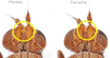 こんにちは。 週初めからChinaへ行っていまして、先ほど帰ってきたところです。 画像の疑問種ですが、Pherbina mediterranea(または その近似の種)の可能性があると思います。 バタバタしておりますので、週末には 参考となる図などをアップしようと思います。 少々お待ちください。(市毛さんでしたら 既に持ってるかも?!) 茨城@市毛様、旧北区の検索表の『 Subarla setae absent』の”Subarla"の翻訳がどうしても見つからなくて前に進めません^^;それでPherbina属とPsacadina属の写真を集めて頭部の比較をしてみたのですが、Pherbina(左)は頭部中央から前面に伸びる溝が前の方で狭くなり、そこに黒いハの字の模様があります。Psacadina(右)は溝が前の方でも狭くならず並行で黒いハの字の模様がないです。これは集める事が出来た写真の範囲でのことなのですけど。。うーーんどうなのでしょうか?*写真は自前の物が無いので、市毛様の写真の頭部を拝借して加工して作らせていただきました。