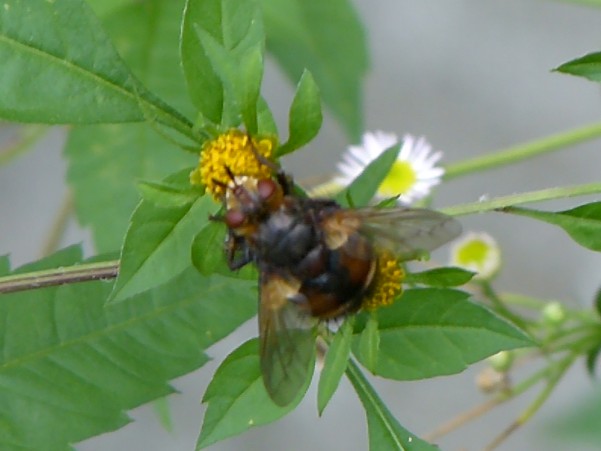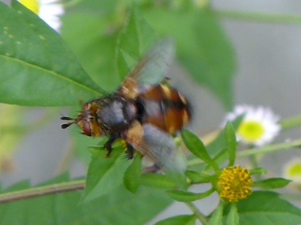 こちらは,ヤドリバエ科のセスジハリバエTachina nupta (=T. mikado)の可能性が高いです. ダイミョウヒラタヤドリバエは下記のHPのPhasia hemipteraを参考にしてください. http://homepage3.nifty.com/syrphidae1/diptera_web/issun_photo.htm |