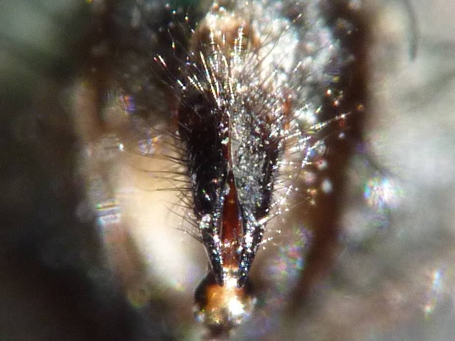 またお世話になります。採集地は愛知県あま市、採集日は2012年12月16日で、体長8[mm]です。 冬でもシラカシの大木に樹液が出ていて、なめにきていました。 12月にハエが採れるというのはうれしいことです。 どうやって調べるかですが、先日教えていただいた大学図書館にはまだ行っていません。利用申請書を顔写真添付で出してその日にはまだ利用できないようですが、 利用証は毎年度更新しなければならず、3月末で期限が切れてしまいます。 4月になったら、天気の悪い日にでも行ってみようと思います。 しかしイエバエ科なら、実は「日本のイエバエ科」を持っています。 写真は、亜科の検索表でも、トゲアシイエバエ亜科の属の検索表でも出てくる、気門の剛毛です。 119ページのDichaetomyiaの検索表は、D. japonica ヤマトハナゲバエに行きつくのですが、ネットで調べると、猫又様がブログに載せてみえたのを見つけ、まさにその通りなのです。 http://nao64s.cocolog-nifty.com/blog/2011/07/post-b9aa.html 小盾板の側面と腹面に毛がないことは、Remarksを見ると、他の種との違いの一つになっているようです。 問題の小盾板背面の剛毛がないことについては、自分の標本でもやはりないのですが、 120ページの図でも描かれていないので、それでいいかとも思ってしまいますがよくないでしょうか。 展開すると見やすくなりました。cerciの先端に針をかけて固定しましたが、自分としてはいつも開けるとは限りません。 先ほどの写真よりももっと丸く見えるのは角度のせいかもしれません。 図とは違い、先端はやはりとがっていません。 側面から見ると、126ページの図eと比べて、先端は曲がっていません。逆にparamereのほうは図よりも尖っているように見えます。 aedeagusは先端が隠れてピントもだいぶ外れていますが、今回は文献に図示されていないのであてにしなくてもいいでしょうか。 他に本文を読んで自分の標本で問題なのは、複眼の疎らで微細な毛が見当たらないこと、 R4+5脈の腹面に2,3本の短い刺毛というのが見当たらないことです。 脈の分岐点も見たのですがないようです。 ヤマトハナゲバエにしては細部がつるんとしているということになります。 今後の参考のためにお尋ねしたいのは、もしかしたら日陰にいるグループなのかどうかという事です。 種名に確信が持てないでいて、他には採集していなくて尋ねるのもおかしなことですが、 Dichaetomyia属に見えるハエの写真を他の場所でいろいろな季節に撮影したことが何度かあります。 日陰だったり、夜間の灯火に来たり、日なたのようでも実際には葉のかげにいたりで、いつも撮りづらいような気がします。 習性として直射日光の当たる所にはあまり出てこないという可能性はあるのでしょうか。 よろしくお願いします。 (あまりたくさんはらない方がいいでしょうか)