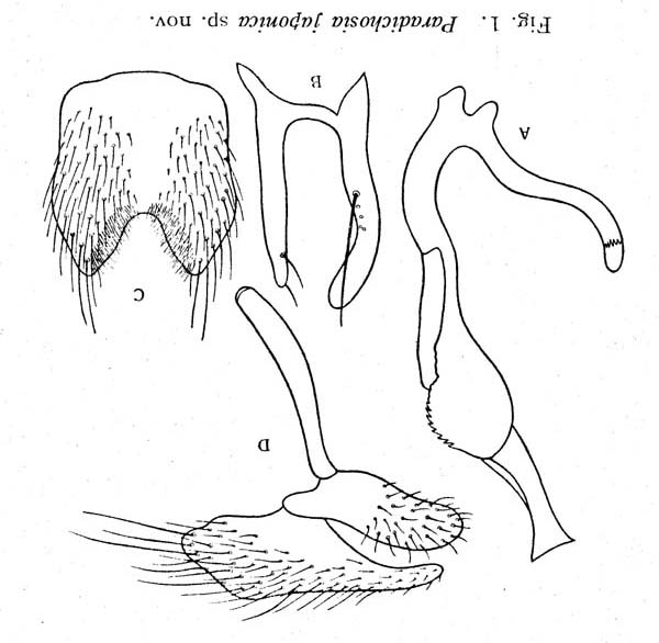 Kurahashi(1965) STUDIES ON THE CALYPTERATE MUSCOID FLIES FROM JAPAN IV : REVISION OF THE GENUS PARADICHOSIA, WITH DESCRIPTION OF TWO NEW SPECIES (Diptera, Calliphoridae) 昆蟲 33(1), 46-52, 1965-03-20 検索表がありますが、iaは1+2、腹部は黄色、と進みました。 学名についてはいろいろと違うようですが、ウヅキイエバエモドキになりました。 ゲニタリアの図はありません。 しかしこの種は、以前ハエ男様がNo.1150から始まるスレッドで画像をあげてみえます。 尾角の先端が開くかどうかなど、違って見えます。 このようなわけで、わかりません。 ご教示いただけたらと思います。よろしくお願いします。