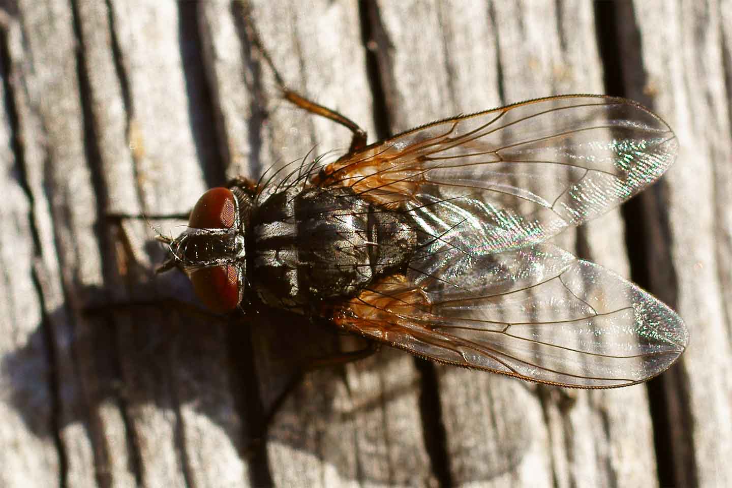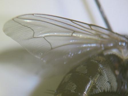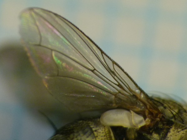 ハナバエ?はどの科を指しているのかはわかりません. イエバエ科Musciadaeのハナゲバエ属Dichaetomyiaやハナバエ科AnthomyiidaeはM1脈が前方に屈曲しません. 写真のようにM1脈が前方に屈曲するのは,ヤドリバエ科Tachinidaeやクロバエ科Calliphoridae,ニクバエ科Sarcophagidaeです. 科の検索については,北隆館の新訂昆虫大図鑑や保育社の原色日本昆虫図鑑(下)を参考にしてください. 見た目は,クロバエ科Calliphoridaeのコクロバエ属Paradichosiaですかね.