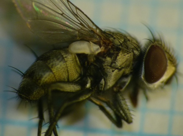 さんごさん、コメントありがとうございました。 了解しました。 もし誰かにつっこまれたら、そのようにお伝えします。 ヤドリニクバエの世界はやはり奥が深く、強烈に難しいのですねー。 もし私の観察が正しければシロオビギンガクヤドリニクバエ幼虫(蛆虫)が食べて育つ餌は鱗翅目の幼虫(ジガバチの貯食物)でもクモ(クモバチの貯食物)でも選り好みしないということになります。 そこまでの広食性はあり得るのかな?と少々疑問(心配)になりました。 ヤマジガバチとオオシロフクモバチの営巣習性(掘坑性)がたまたま似ているので産仔できましたけど、結局獲物が口に合わなくて成虫まで育たないかもしれませんね。 そうなってくるとやっぱり、カリバチの巣を暴いて貯食物を採集し、飼育下で寄生ハエ成虫を得るのが一番確実のような気がします。 とにかく小さなハエなので、交尾中のペアを見つけて採集するというのは不慣れな私には至難の技だと思います。 あまり当てになさらず、気長にお待ち下さい。